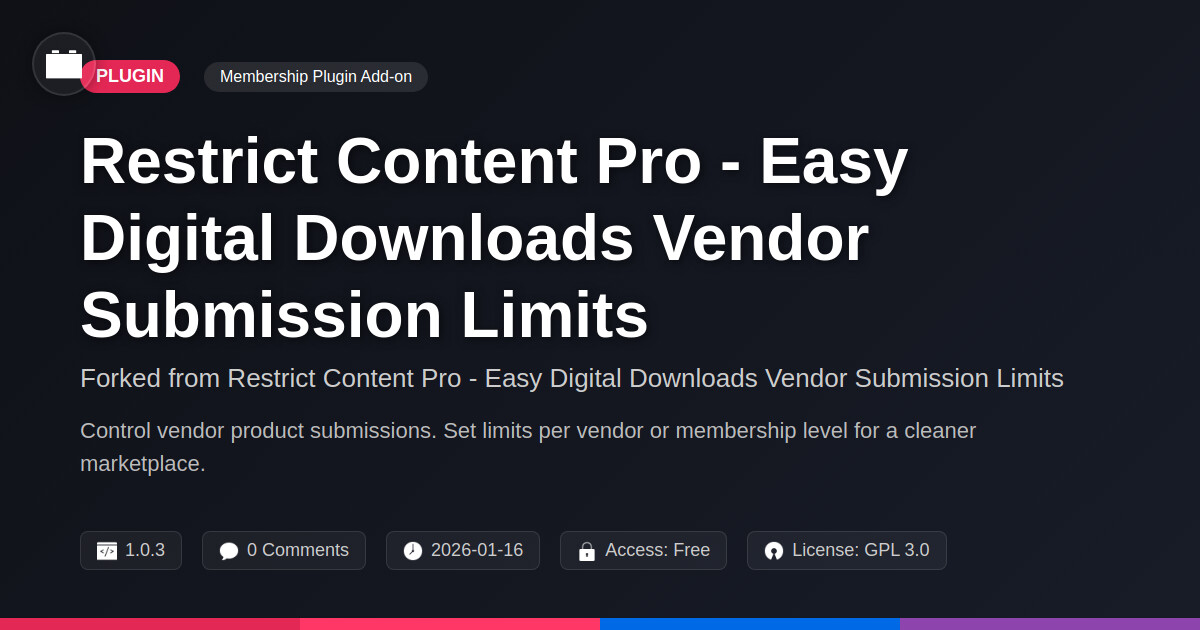 | Forked from | Restrict Content Pro - Easy Digital Downloads Vendor Submission Limits |