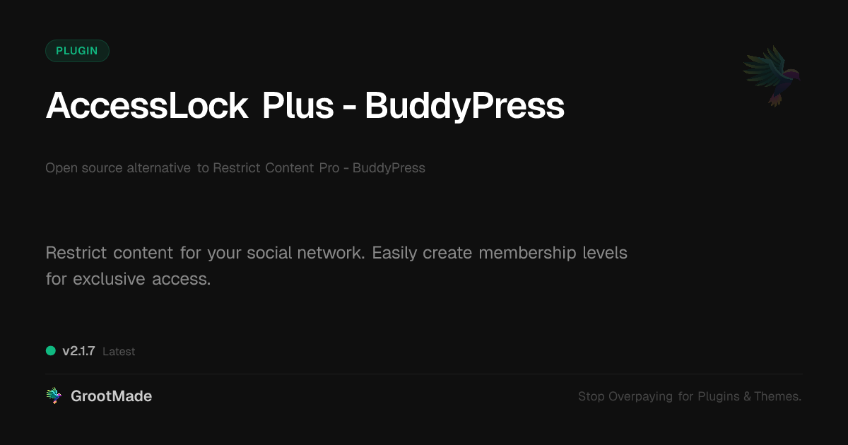 | Tags | Membership, access control, social networking features, community access control, download forms, deal finder plugin, Security, Login, Protection, restricted content, authentication, content restriction, user management, Digital Downloads, profile tab builder, Community, Buddypress, user role visibility, member communication plugin, user contact form |