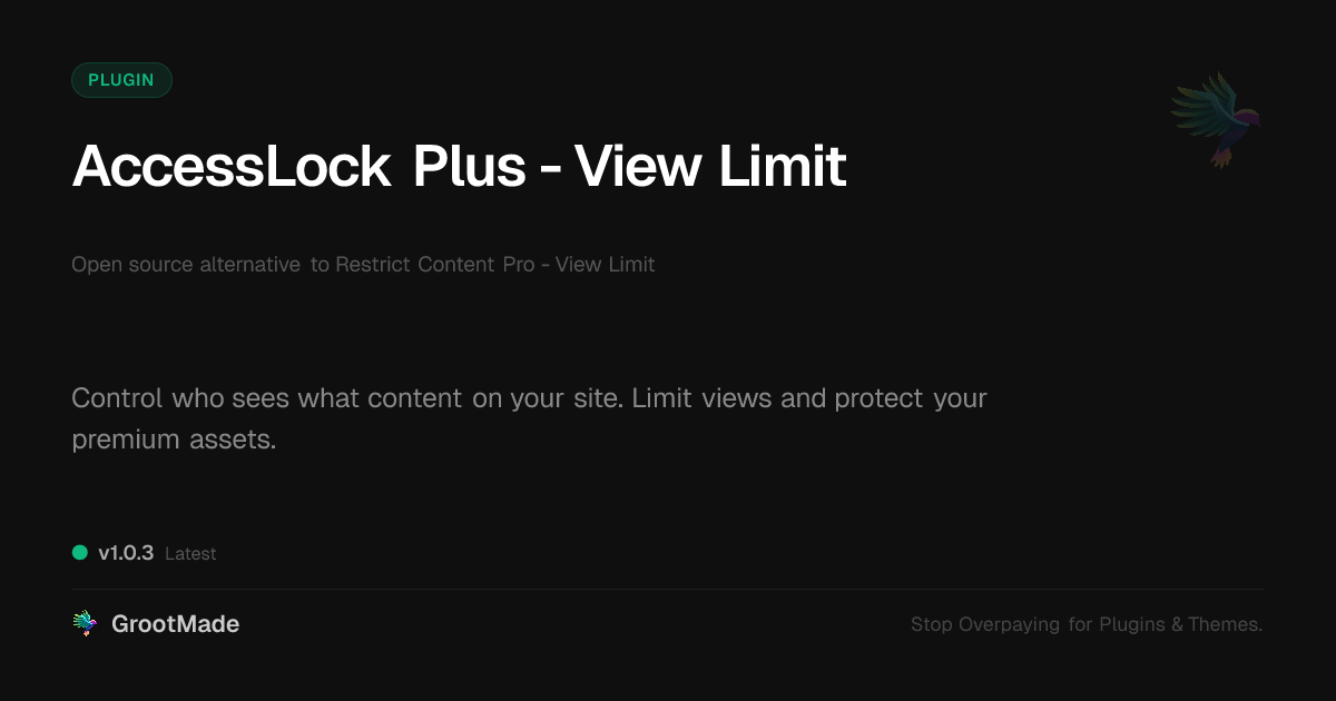 | Tags | Membership, access control, premium content, content protection, user roles, membership site tools, premium content access, restrict content, content view limiter, view count restrictions, blog to product sales, Paywall, Digital Rights, View Limits, content restriction, design expansion pack, Subscription |