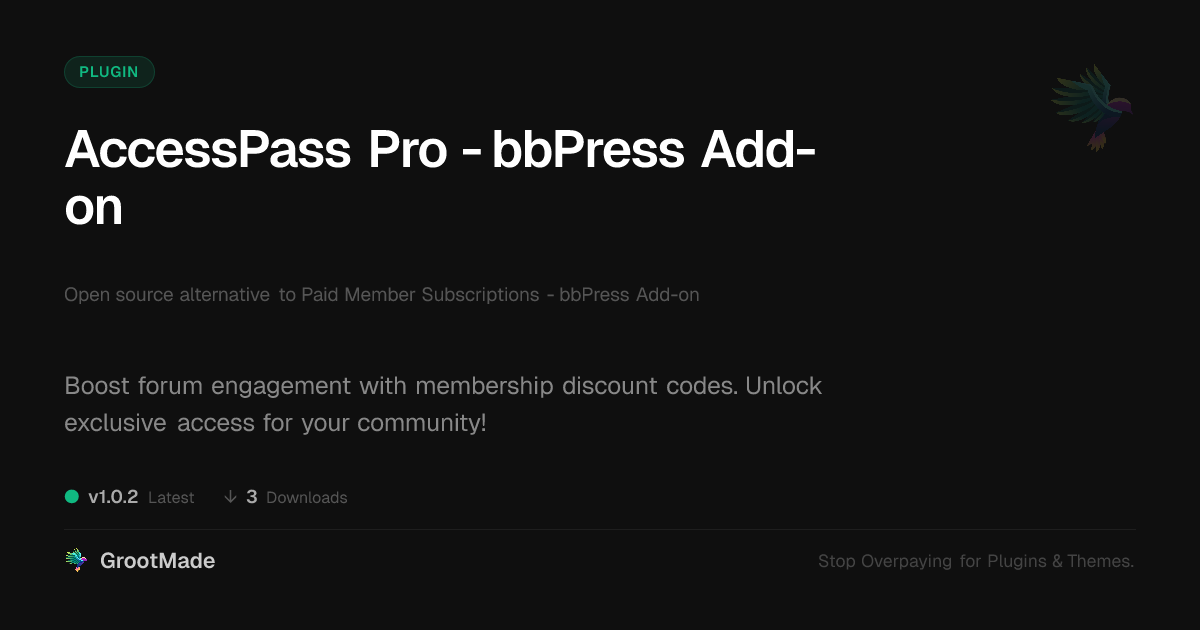 | Tags | Subscriptions, product metadata indexing, data tracking software, WC, membership discount codes, User Discounts, Membership, bbpress forum access, Pricing, paid membership add-on, ecommerce, profile tab builder, discount codes, community forum discounts, member profile enhancements, Promotions, Coupons, site plugin, Checkout, restricted content access |