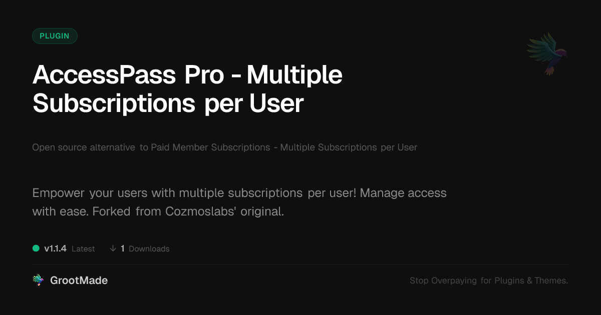 | Tags | Subscriptions, content restriction, User Accounts, Recurring Payments, access control, multiple subscriptions, Membership, user role visibility, membership management, paid content, site access plugin, profile tab builder, premium content, Payment Gateways, user access control, member management |