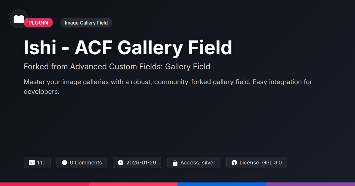 | Tags | developers, developer gallery plugin, media management, advanced custom fields, gallery, content management tools, acf gallery field fork, custom image field, WP image gallery, WP community tools, product likes plugin, multilingual translation, Media, Images, Acf, WP plugin, content management, directory comparison, custom fields, photo gallery, user contact form |