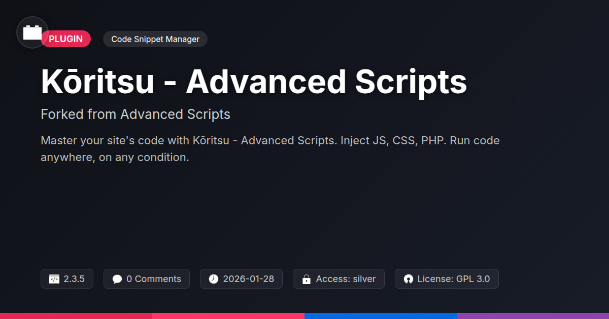 | Tags | custom code snippets, site customization, javascript manager, customization, developer, css injector, php script manager, file download form, form to download link, visual asset security, Functionality, Tools, Optimization, Snippets, Hooks, Advanced, Scripts, Code, performance, online community safety, online content presentation, member communication plugin, user role visibility, user contact form |