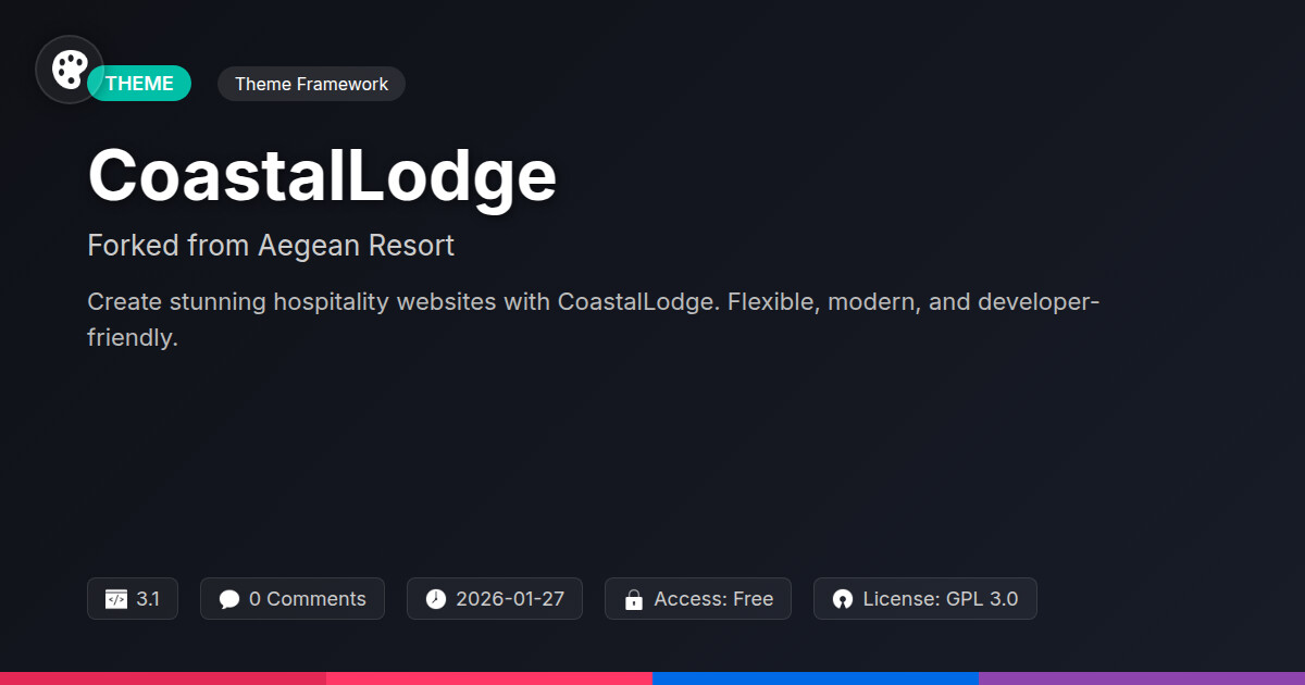 | Tags | site governance solution, Resort, coastal theme, Hospitality, resort theme, Leisure, Beach, Travel, Hotel, visual promotion addon, Accommodation, member data control, Tourism, digital identity control, hospitality theme, Vacation, Booking, agency theme, developer friendly theme |