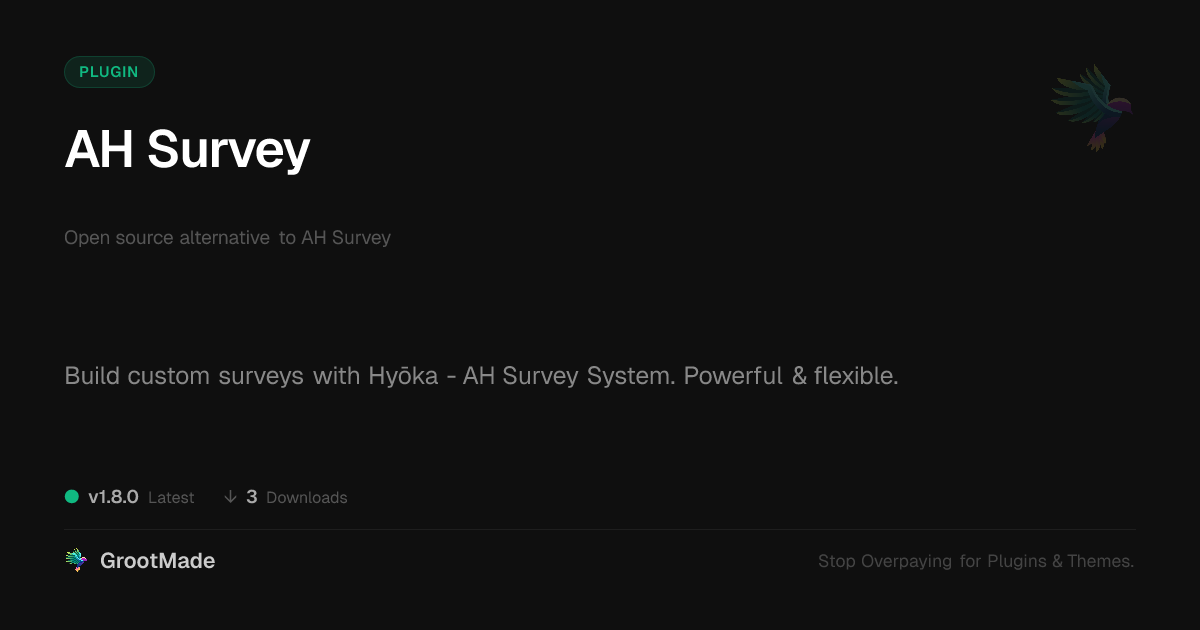 | Tags | open source alternative, form plugin, data collection tool, survey builder, mobile forum optimization, Analytics, Polls, Survey, User Research, Assessment, Questionnaire, Evaluation, real estate theme functionality, Feedback, online community safety, Digital Downloads, clean shop design, pagination addon, profile tab builder, Forms, data collection, user role visibility, member communication plugin, user contact form |