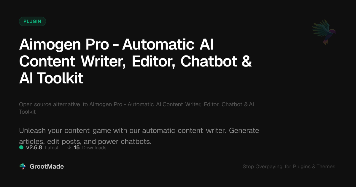 | Forked from | Aimogen Pro - Automatic AI Content Writer, Editor, Chatbot & AI Toolkit |
