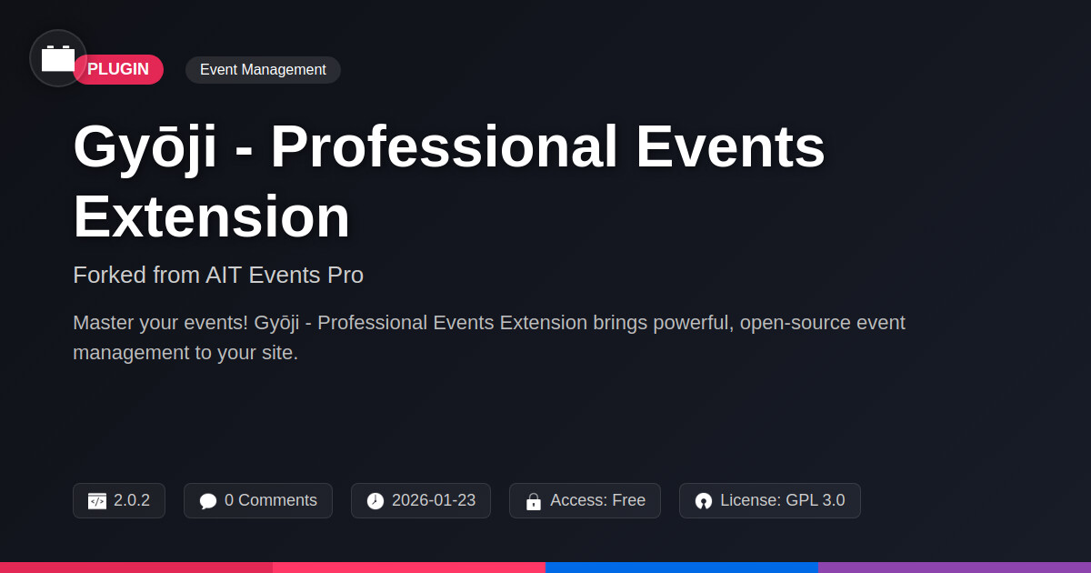 | Tags | event management plugin, event booking, open source events, event calendar, WP events, website events, event promotion, event planner, content spotlight plugin, developer tools plugin, Scheduling, Calendar, Pro Features, multilingual website plugin, online community safety, Event Organizer, data visualization tools, Events, event management, event registration, profile tab builder, user role visibility, user contact form |