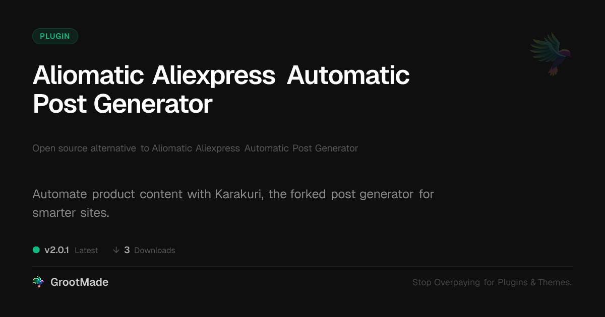 | Tags | affiliate marketing, e-commerce tools, content automation, seo, post generator, faster theme development, Product Feeds, Aliexpress, Automated Posts, Dropshipping, WP plugin, content generation, product import, Digital Downloads, recent profile visitors, ecommerce |