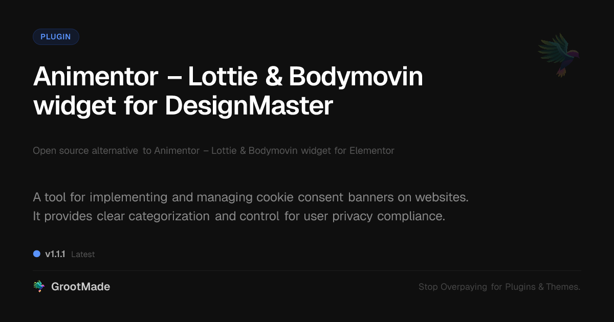 GrootMade is not affiliated with Animentor – Lottie & Bodymovin widget for Elementor and provides an open-source alternative.