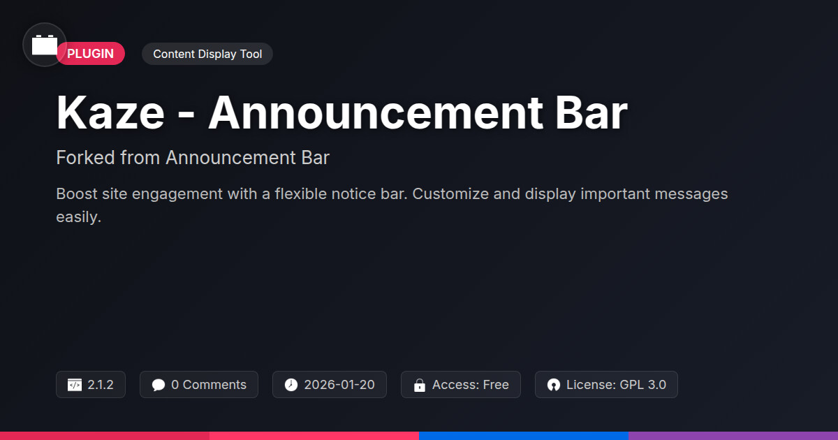 | Tags | site announcements, marketing tool, notification bar, sticky header, announcement bar, call to action, messaging plugin, website banner, site notifications, content announcement bar, promotional banner tool, site notification plugin, web alert plugin, Alert Bar, Customizable Bar, digital identity control, recent profile visitors, profile tab builder, user contact form |