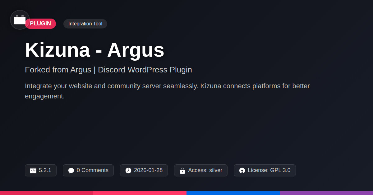 | Tags | open source integration, WP, discord WP plugin, website community integration, website notifications server, website server sync, download forms, dynamic web elements, viral content theme, esports theme, Social, Moderation, Messaging, Chat, Bot, Discord, online community safety, Digital Downloads, integration, Community, e-commerce feature, community engagement, image migration plugin, cms caching, Notifications |