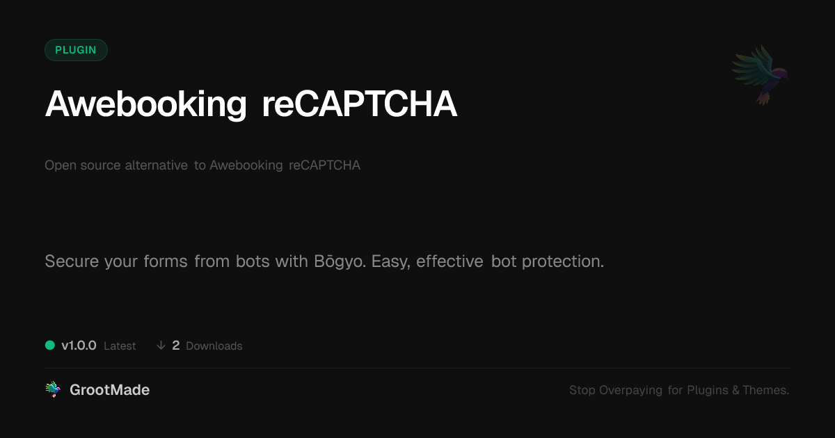 | Tags | bot protection, form security, spam protection, booking plugin, spam prevention, CAPTCHA, user verification, member data control, media addon, visual promotion addon, help desk plugin, e-commerce bidding, Security, Recaptcha, Awebooking, booking system, website security, digital identity control, Digital Downloads, anti-spam |