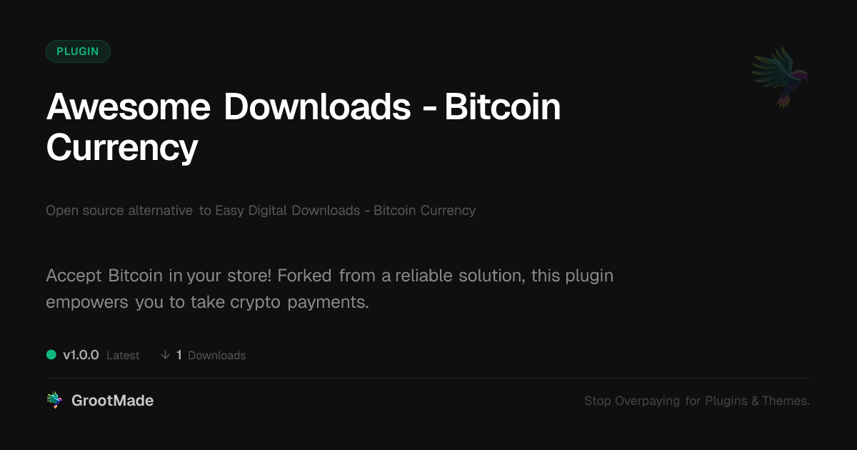 | Tags | downloadable media addon, publish scheduler, Digital Currency, Downloads, bitcoin payment gateway, open source payments, user role visibility, search enhancement tool, ecommerce bitcoin, file management, ecommerce, digital downloads crypto, Cryptocurrency, tax compliance tool, Payment Gateway, developer cryptocurrency, Bitcoin Integration, GA4 server-side tracking, File Downloads, analytics tracking, Bitcoin, digital payments |
