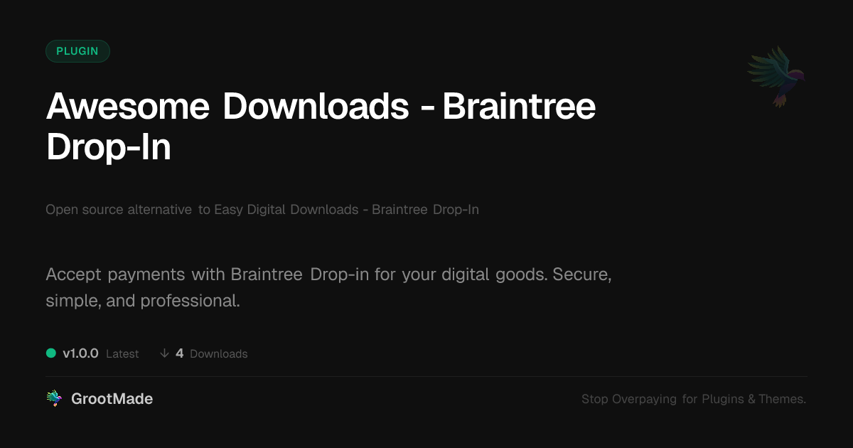 | Tags | Payment Processing, braintree payment gateway, cms plugins, image gallery pagination, Product Delivery, Braintree, digital product sales, ecommerce integration, Payment Gateway, data tracking software, secure payments, Checkout, Subscription Payments, Online Payments, online community safety, digital delivery, member profile enhancements, user contact form, WC, user role visibility, profile tab builder, member communication plugin, ecommerce |