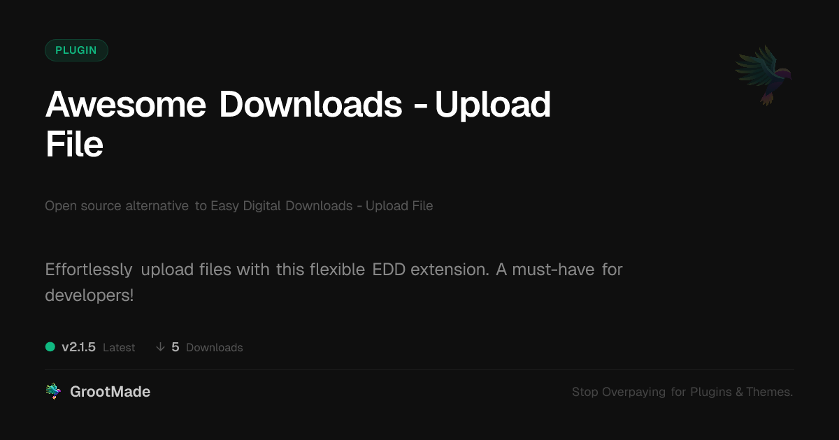| Tags | File Upload, digital products, Downloads, file upload extension, e-commerce developer tool, file management, ecommerce, file sharing, Digital Downloads, mailerlite integration plugin, WP plugin upload, custom product upload, Edd, GA4 server-side tracking, File Storage, wp contact forms, digital goods plugin, File Handling |