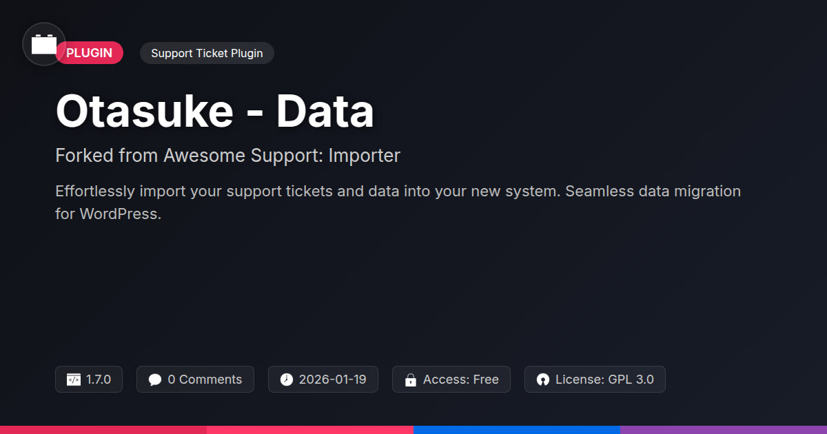 Tags Support System, ticket management, csv import, data migration, ticket system, data migration plugin, open source data tool, support ticket import, ticketing system importer, WP support tool, customer service, download analytics plugin, Import, Support Tickets, Helpdesk, user management