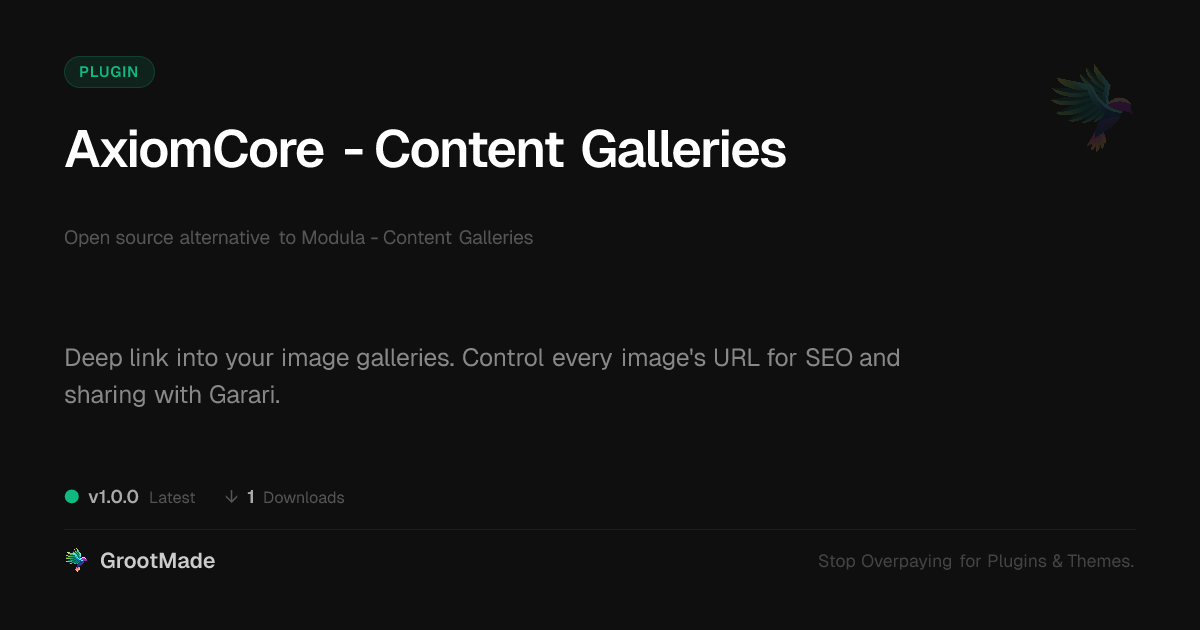 | Tags | image gallery plugin, visual content management, image gallery, gallery, image display, gallery deep linking, custom image urls, seo for galleries, WP community tools, Content Gallery, Grid Gallery, directory comparison, photo gallery, responsive gallery, WP gallery, Media Gallery, portfolio, user role visibility |