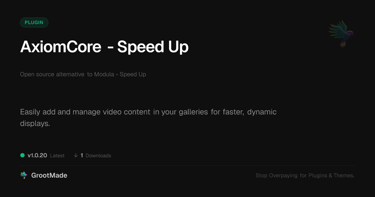 | Tags | video integration, image optimization, gallery plugin, speed optimization, image compression, gallery, seo, WP community tools, Caching, Lazy Load, performance, website speed, digital identity control, user experience, Digital Downloads, open source gallery, user contact form, member communication plugin |