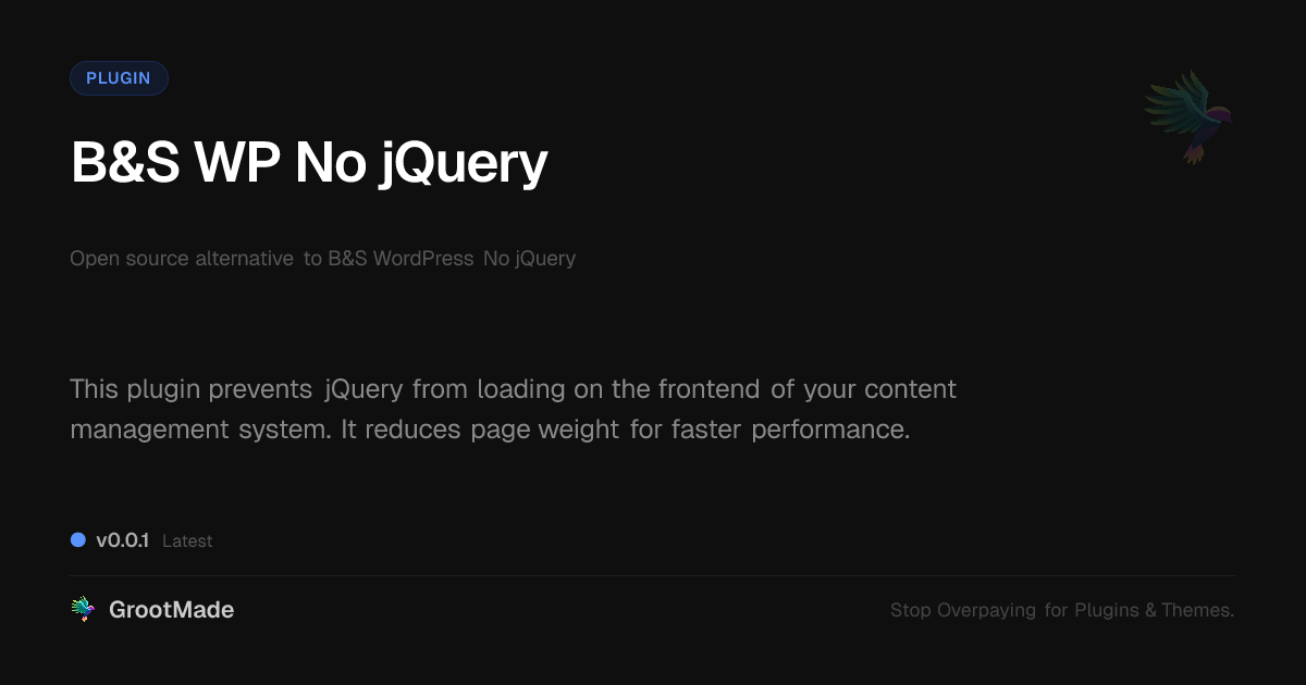 GrootMade is not affiliated with B&S WP No jQuery and provides an open-source alternative.