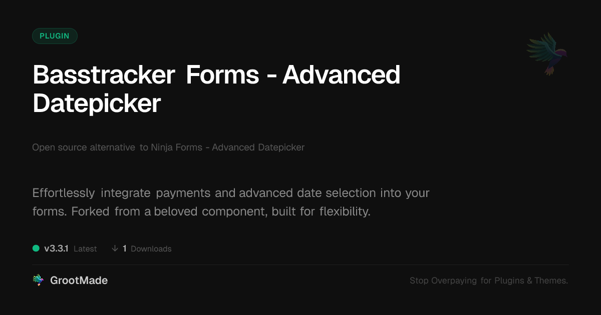 | Tags | form customization, advanced date picker integration, customizable payment forms, developer friendly payment plugin, e-commerce form solution, payment gateway form builder, Scheduling, Calendar, Appointments, Datepicker, Date Field, Ninjaforms, Booking, multilingual website plugin, clean shop design, pagination addon, profile tab builder, form builder, Forms, user role visibility |