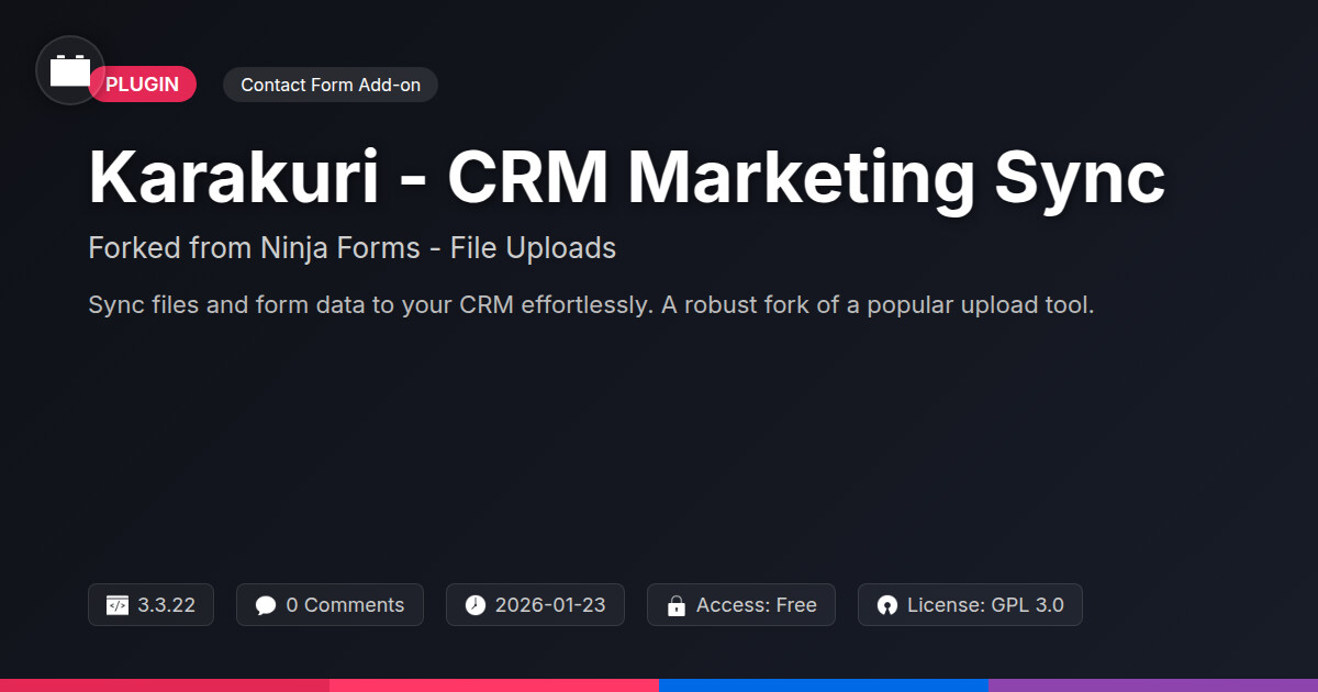| Tags | crm integration, form data sync, email marketing, lead management, file upload plugin, business tools, WP form upload, digital product sales email, Sales, Sync, Customer Relationship, automation, crm, marketing automation, member profile enhancements, profile tab builder, integration, marketing, user role visibility, user contact form, member communication plugin |