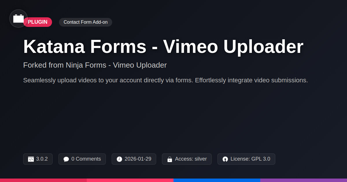 Tags digital asset management, form submission, video form, vimeo uploader, software beta testing, downloadable product plugin, payment status, wp contact forms, Multimedia, Video, File Upload, Vimeo, Video Hosting, Upload, user submissions, content management, content creation tool, clean shop design, pagination addon, profile tab builder, form builder, Forms