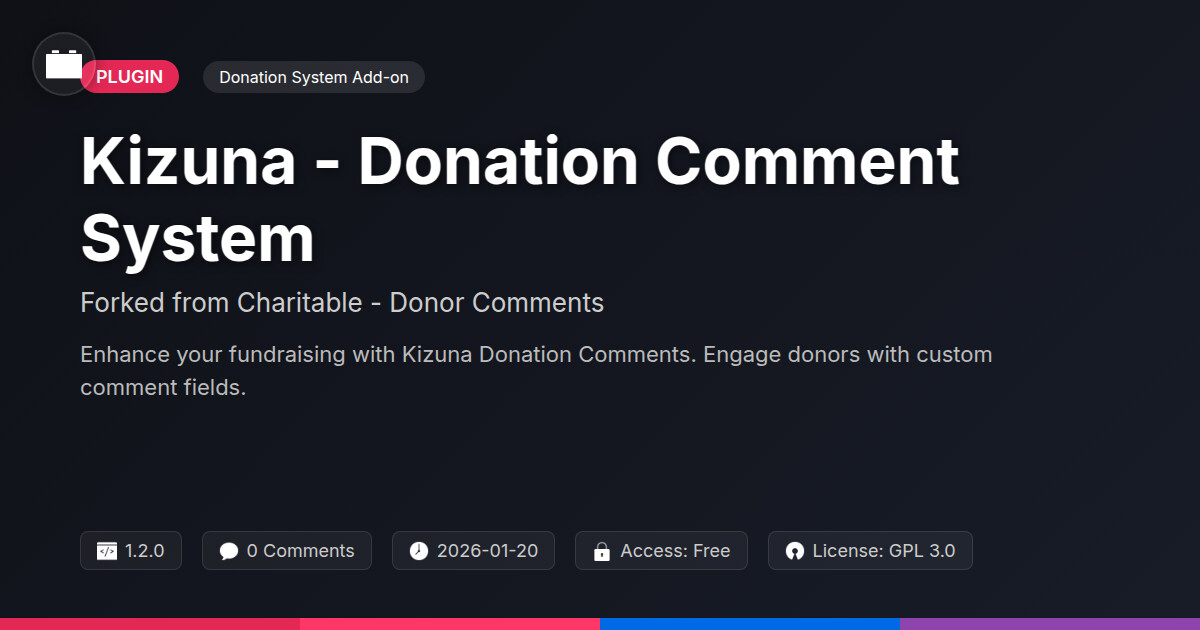 | Tags | user interaction, social engagement, comment on donations, donation form engagement, donation system comments, donor feedback plugin, fundraising comments, download forms, gaming theme, Payments, Comments, Nonprofit, Donations, Charity, digital identity control, online community safety, profile tab builder, Community, Fundraising, Crowdfunding |