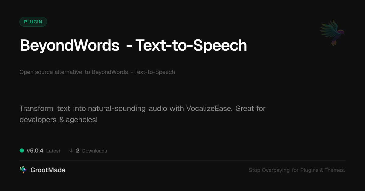 | Tags | accessibility, content accessibility, audio content, speech synthesis, text to speech, voice generator, content creation, product launch tool, gallery audio, Audio, Multilingual, Podcasting, Voiceover, Media Publishing, automation, recent profile visitors, profile tab builder, user contact form |
