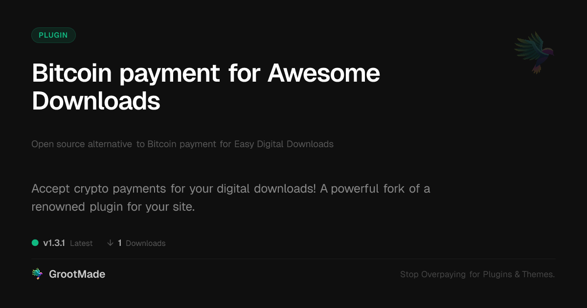 | Tags | e-commerce crypto, Blockchain, publish scheduler, data tracking software, online store, Payments, search enhancement tool, easy digital downloads, crypto for sellers, decentralized payments, download gateway, ecommerce, Digital Downloads, mailerlite integration plugin, Cryptocurrency, Payment Gateway, content locking plugin, digital currency payments, Checkout, analytics tracking, Bitcoin |