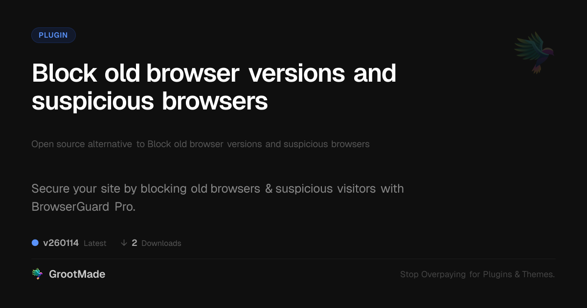 GrootMade is not affiliated with Block old browser versions and suspicious browsers and provides an open-source alternative.