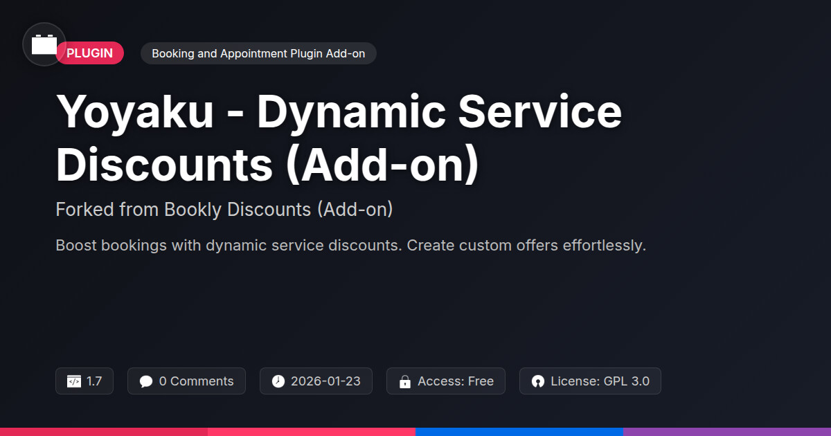 | Tags | appointment pricing, booking discounts, deal creator, dynamic discounts, service discounts, installments, Scheduling, Loyalty, Discounts, Coupons, Deals, Appointments, Bookly, Booking, Pricing, multilingual website plugin, online community safety, site plugin, profile tab builder, user role visibility, Promotions, member communication plugin |