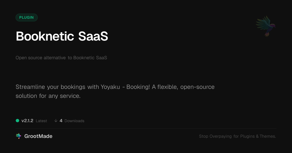| Tags | open source booking, service scheduling, booking plugin, online booking, appointment system, booking for agencies, saas, Scheduling, Appointment, Calendar, Reservations, Business Management, Service Provider, Booking, automation, multilingual website plugin, online community safety, profile tab builder, user role visibility, user contact form |