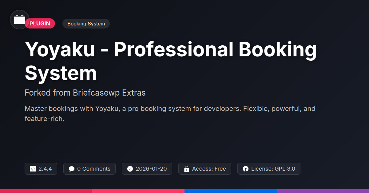 | Tags | open source booking, appointment scheduling, responsive design, customization, WP booking solution, booking system plugin, WP theme, developer booking tool, design tools, WP community tools, gallery plugin development, clan website theme, Developer Tools, Frontend, Briefcasewp, Theme Extensions, Theme Addons, website builder, online community safety, member profile enhancements, member communication plugin, user role visibility, user contact form |
