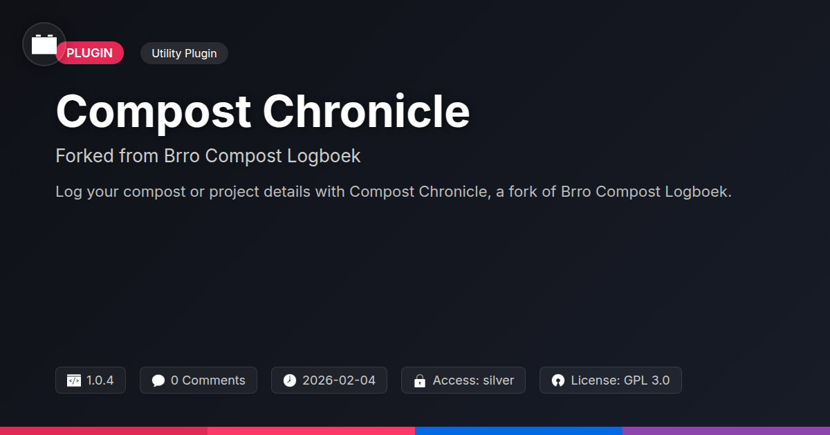 | Tags | compost log, recent profile visitors, buddy press integration, Compost Tracker, Sustainability, gardening, Recycling, open source plugin, logbook plugin, project tracking, conditional product logic, Composting, user contact form, developer tool, profile tab builder, Environment, Organic, Green Living, Waste Management, digital identity control, Eco Friendly, lookup table plugin, php script repository |