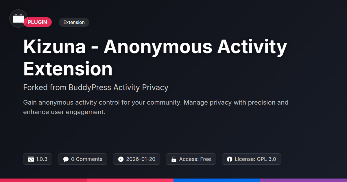 | Tags | social networking plugin, user tracking, activity stream control, anonymous activity, community privacy, user behavior, member privacy, mobile forum optimization, content security for websites, Analytics, Tracking, Engagement, Activity, Anonymous, Anonymous Data, Insights, digital identity control, privacy, recent profile visitors, profile tab builder, IT-tech fork, film gallery plugin, classifieds tool, user contact form |