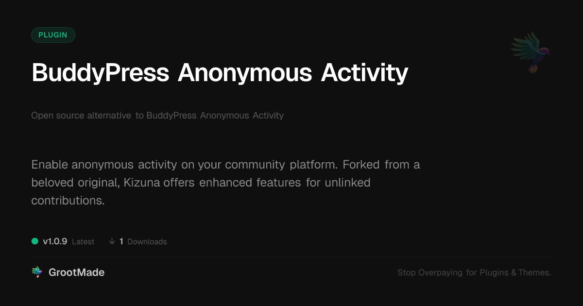 | Tags | open source community, forums, anonymous activity plugin, platform participation, download forms, dynamic web elements, seo theme, customizable site builder, viral content theme, Groups, Social, Networking, Posts, Activity, Anonymous, privacy, Digital Downloads, profile tab builder, film gallery plugin, Community, e-commerce feature, Buddypress, classifieds tool, community engagement tools |