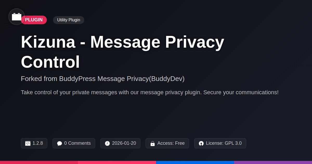 | Tags | community plugin, member communication, buddy, message privacy, user privacy, download forms, dynamic web elements, seo theme, full screen theme, Security, Communication, Messaging, Private Messages, open source, privacy, Digital Downloads, profile tab builder, film gallery plugin, Community, Buddypress, Social Network, classifieds tool |