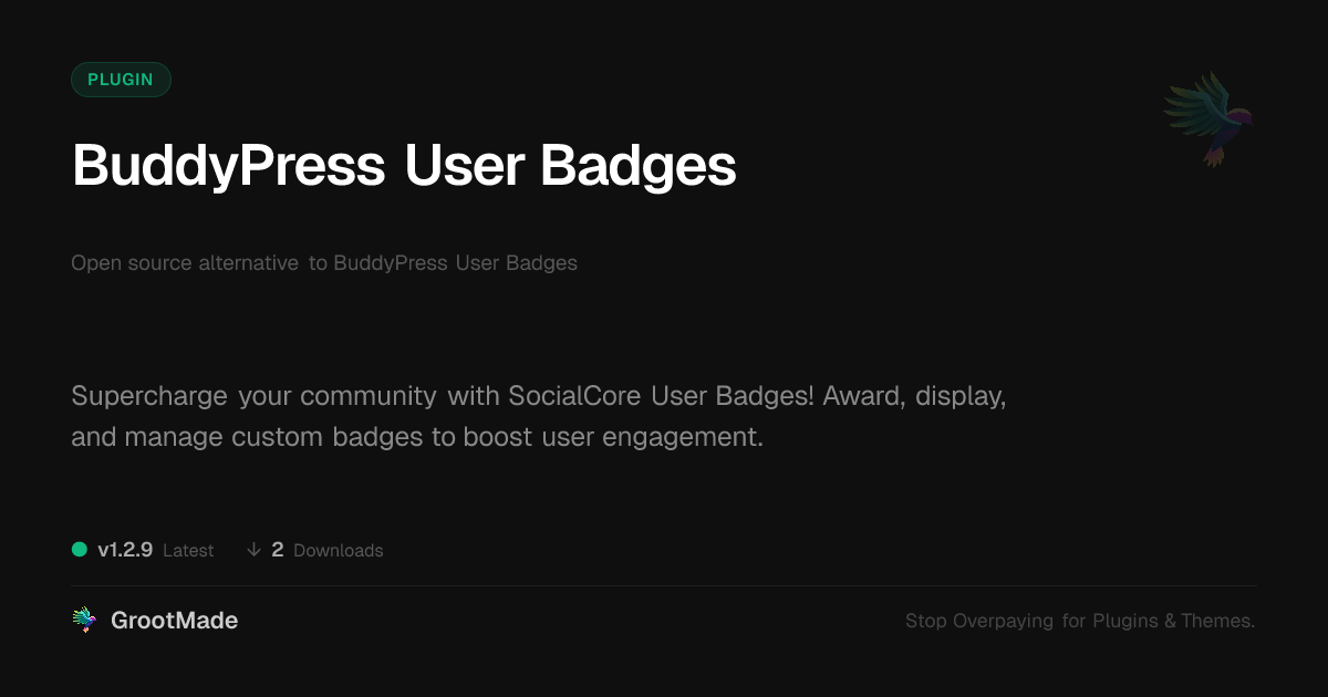 | Tags | Community, Buddypress, social features, film gallery plugin, Recognition, profile customization, member recognition, Social Network, Achievements, e-commerce feature, Badges, dynamic web elements, profile tab builder, gamification, download forms, user engagement, user badges, digital identity control, user rewards, seo theme, community plugin, engagement tool |