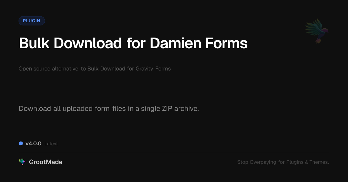 GrootMade is not affiliated with Bulk Download for Gravity Forms and provides an open-source alternative.