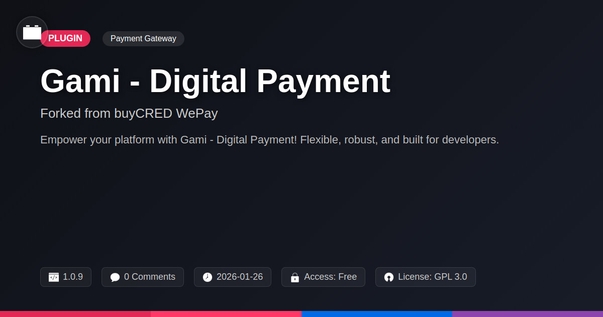 | Tags | Membership, open source payments, digital payments, website payments, points system, layered scrolling plugin, Credit System, Wepay, Buycred, Reward Points, monetization, digital identity control, Payment Gateway, Online Payments, Digital Downloads, profile tab builder, film gallery plugin, classifieds tool, Ecommerce, user role visibility, user contact form |