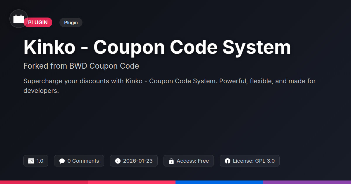 | Tags | discount management, eCommerce tools, coupon code system, domain blocker, Deals, Savings, Offers, Shopping, Discount, Coupon, open source plugins, digital identity control, data tracking software, Checkout, online community safety, product metadata indexing, web development, WC, profile tab builder, user role visibility, Ecommerce, Promotions |