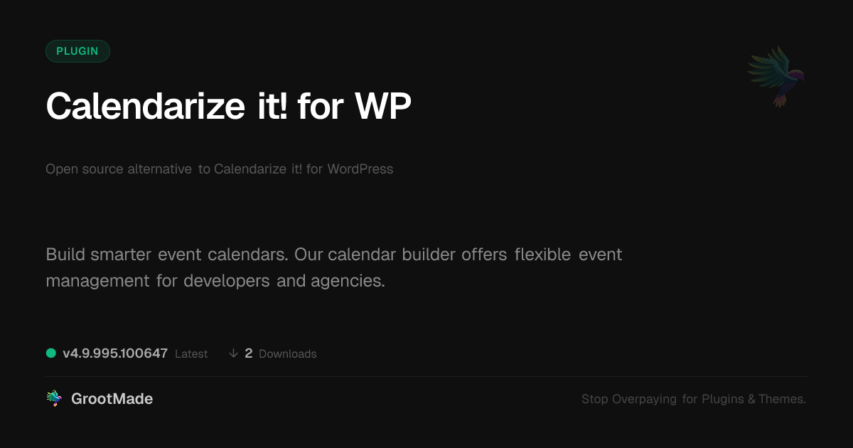 | Tags | open source events, event calendar plugin, website event manager, time management, schedule builder, content spotlight plugin, developer tools plugin, Scheduling, Calendar, Appointments, Bookings, Wp Calendar, Date Picker, multilingual website plugin, directory comparison, developer calendar tool, Event Organizer, data visualization tools, Events, event management, profile tab builder, user role visibility |
