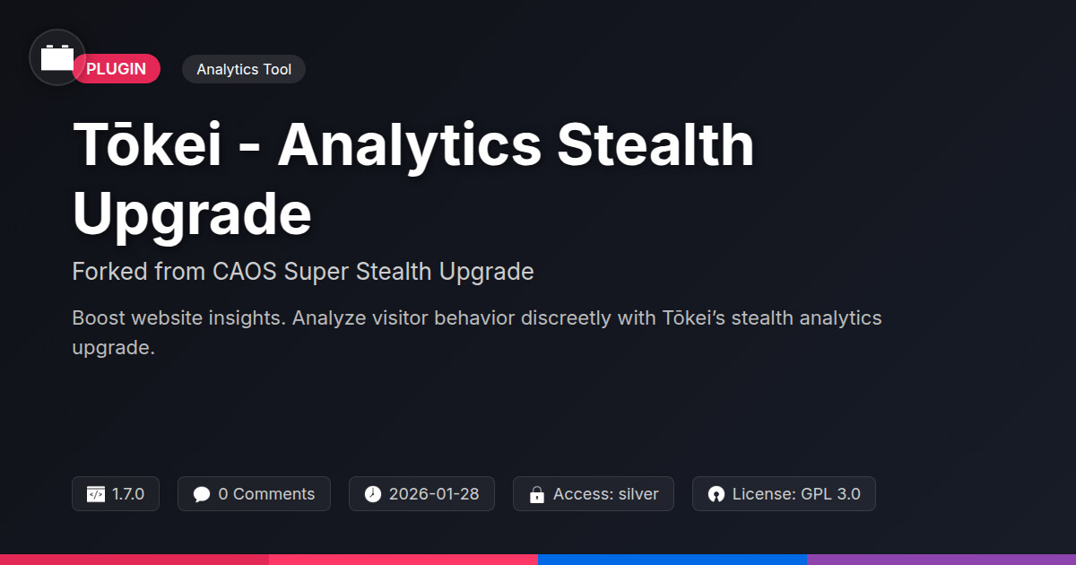 | Tags | developer analytics tool, analytics management, analytics stealth, discreet website tracking, website analytics privacy, mobile forum optimization, visual asset security, Analytics, Optimization, Caching, Tracking, Stealth Mode, performance, website speed, privacy, Google Analytics, profile tab builder, IT-tech fork, data collection, open source analytics, member communication plugin, user role visibility, user contact form |