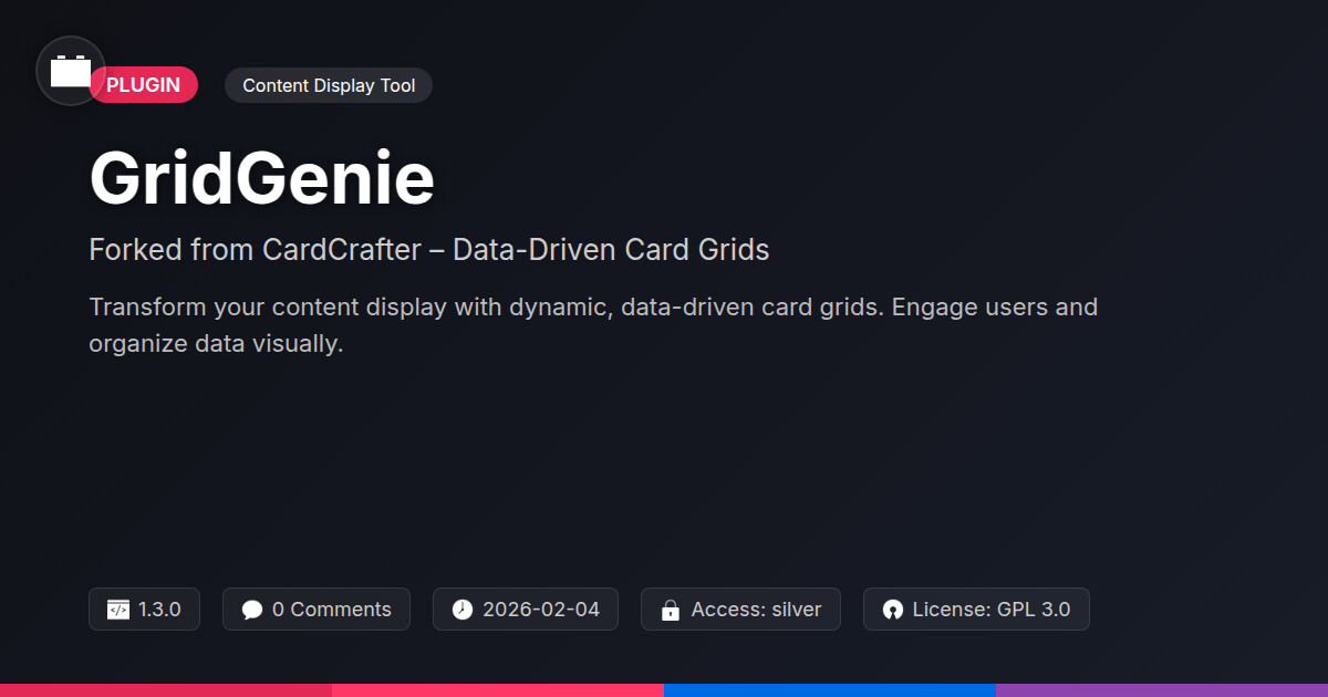 | Tags | customization, content heavy site, WP community tools, Data Driven, user role visibility, Layouts, website plugin, Card Grids, Widget, developer tool, profile tab builder, dynamic content, content display, responsive grids, card layout, online community safety, News Aggregation, visual content, design tool, data grid |