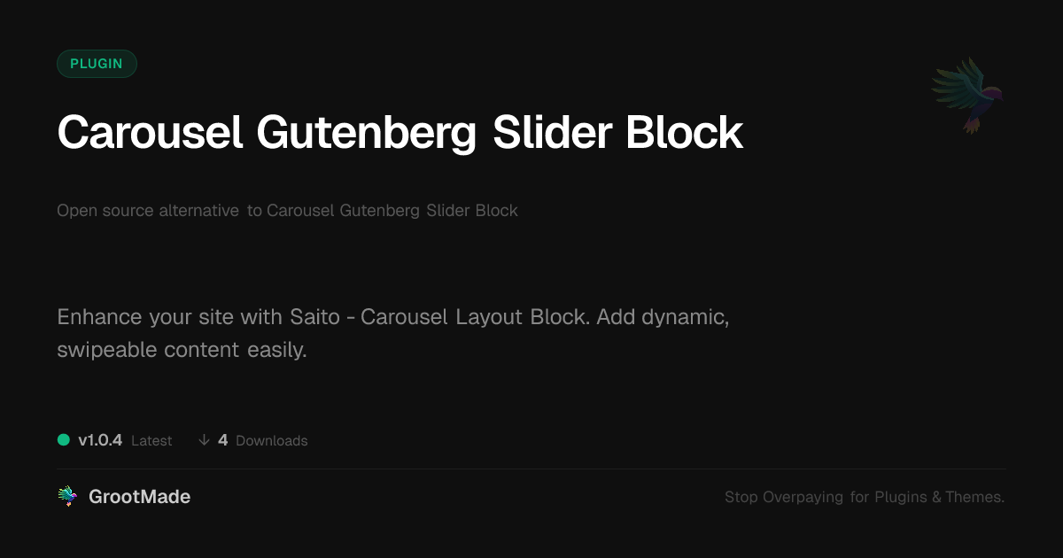 | Tags | dynamic content, content slider, web design, gutenberg, carousel block, gutenberg block, layout block, WP community tools, Slideshow, Carousel, Block, digital identity control, image slider, Media Gallery, responsive, member communication plugin, Slider, user contact form |