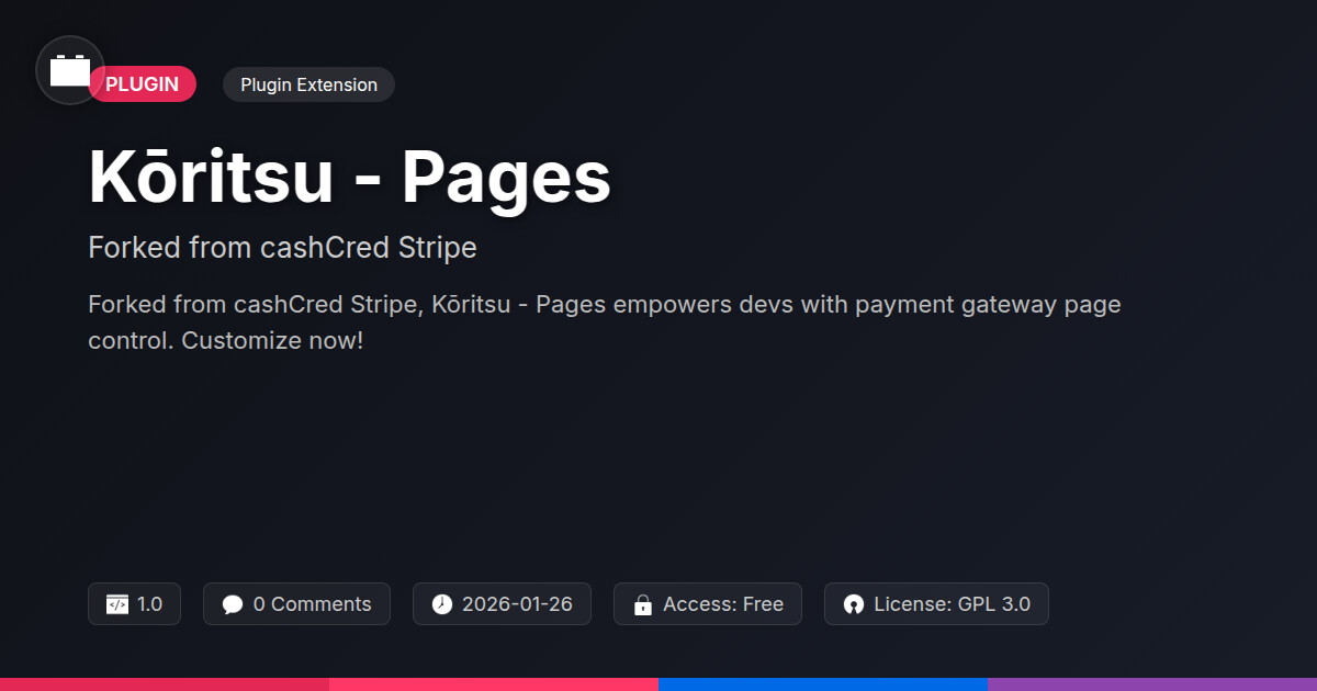 | Tags | payment integration, transaction processing, open source extension, forked plugin, payment gateway pages, WP media import, Payments, Wallet, Credit, Stripe, Gateway, Cashcred, Money Transfer, Transactions, Online Payments, Digital Downloads |