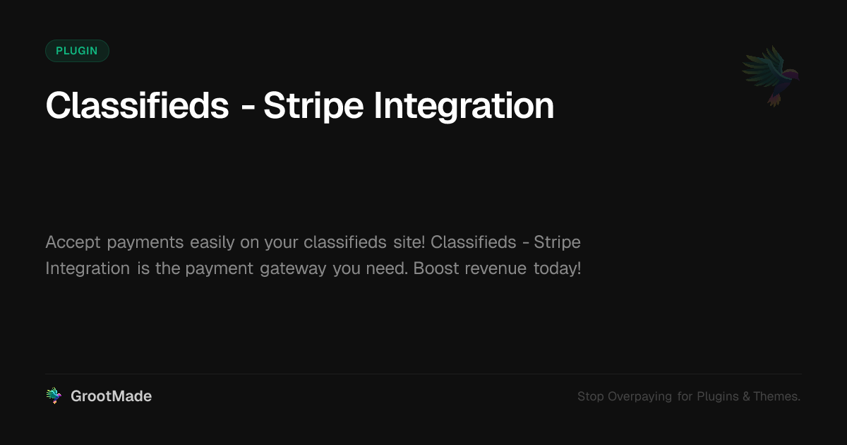 | Tags | eCommerce extensions, emoji plugin, online transactions, content planning tool, WP content management, custom form solution, classified ads, print automation, service sales, Payments, Stripe, Classifieds, Credit Card, Premium Listings, open source tools, monetization, Payment Gateway, online community safety, directory comparison, payment export cli, Ecommerce, user role visibility |