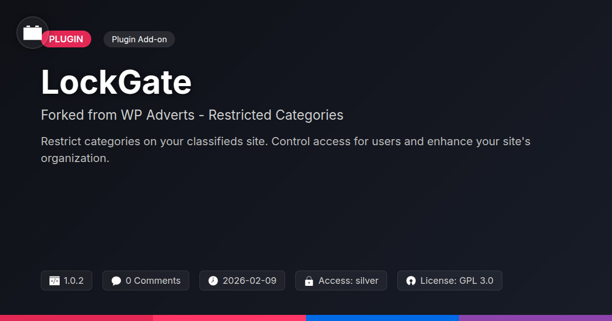 | Tags | Membership, access control, deal finder plugin, e-commerce bidding, classifieds site categories, custom ad categories, restrict ad categories, wp adverts restricted categories, wp adverts users, Security, Login, Protection, Password, restricted content, authentication, privacy, user management, profile tab builder, user contact form |