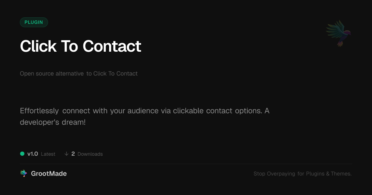 | Tags | contact form plugin, site communication, contact form, click to chat, contact button, clickable contact, open source contact, business tools, Website Widgets, community forum acceleration, full screen theme, domain blocker, Conversion, Communication, lead generation, digital identity control, directory comparison, Digital Downloads, pagination addon, user engagement, customer support, user contact form, member communication plugin, user role visibility |
