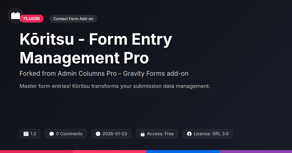 | Tags | form analytics, form management, data export plugin, form entry management, form submission, customizable form columns, Form Entries, User Data, Pro Forms, Entry Tracking, contact forms, gravity forms alternative, Digital Downloads, pagination addon, profile tab builder, form builder, data collection, user role visibility, user contact form |